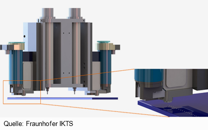 Bei diesem Verfahren erfolgt der Auftrag des Materials nicht vollflächig, sondern nur an den Stellen, an denen es benötigt wird. Eine heizbare Dispenseinheit, die in allen drei Raumrichtungen angesteuert wird, bewegt sich über eine fest stehende Plattform, auf der eine Metall- oder Glasplatte als Träger für das Keramikmaterial fixiert ist. Die thermoplastische Masse wird zur Verarbeitung durch Wärmezufuhr in einen fließfähigen Zustand überführt und erstarrt sofort wieder bei Abkühlung. Dadurch erfolgt die Verfestigung der Masse nahezu unabhängig von den physikalischen Eigenschaften der verwendeten Pulver. Es können mehrere Vorratsbehälter und Dispenseinheiten verwendet werden und somit unterschiedlichen Materialien ortsaufgelöst in einem Bauteil abgeschieden werden.